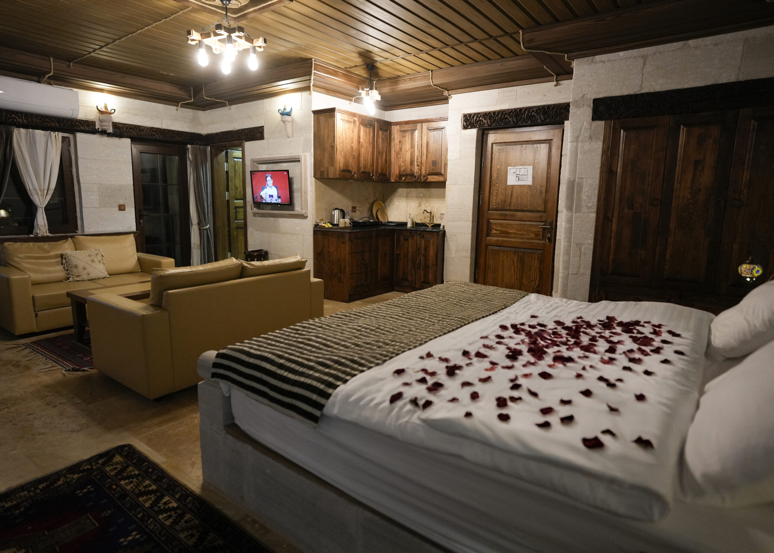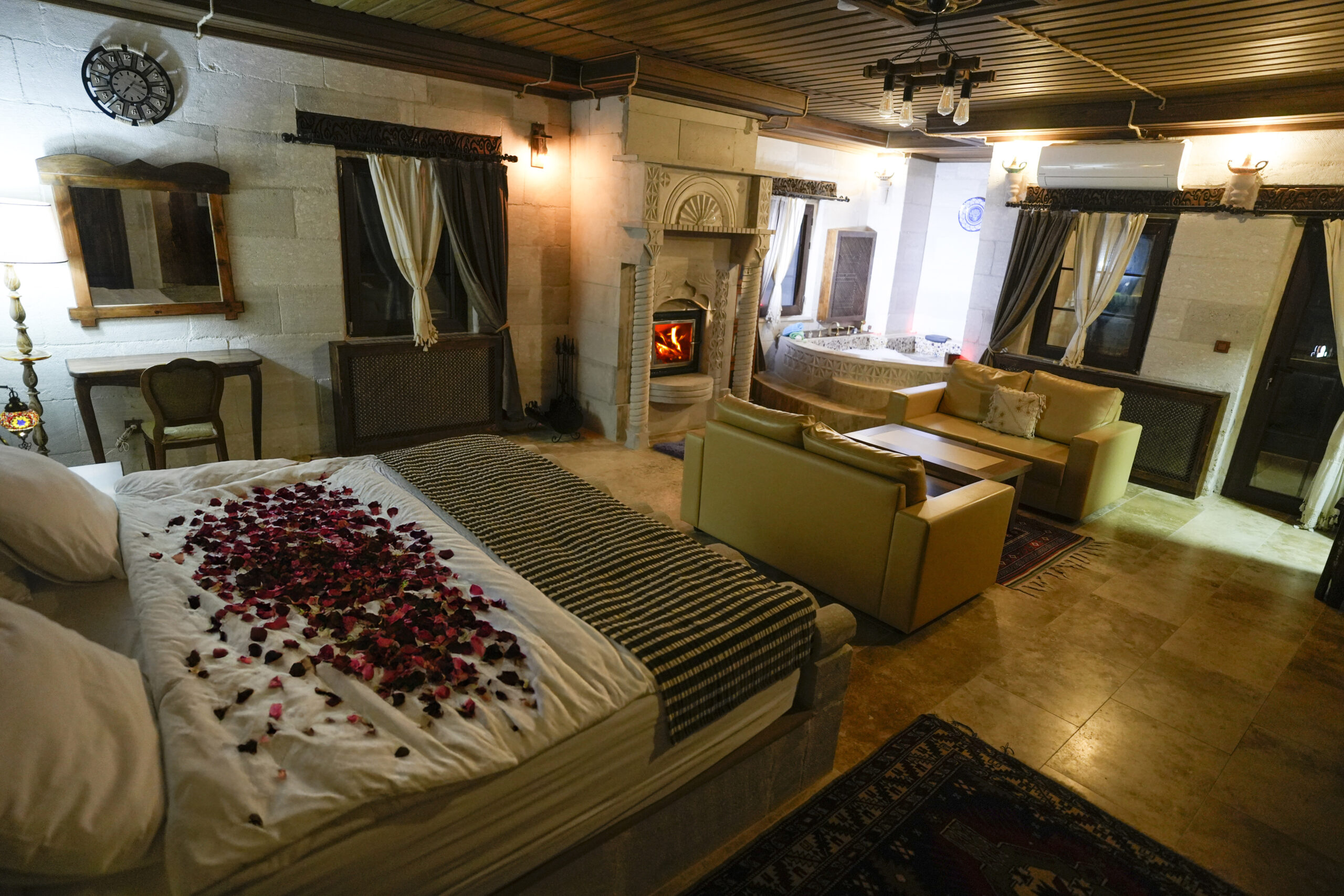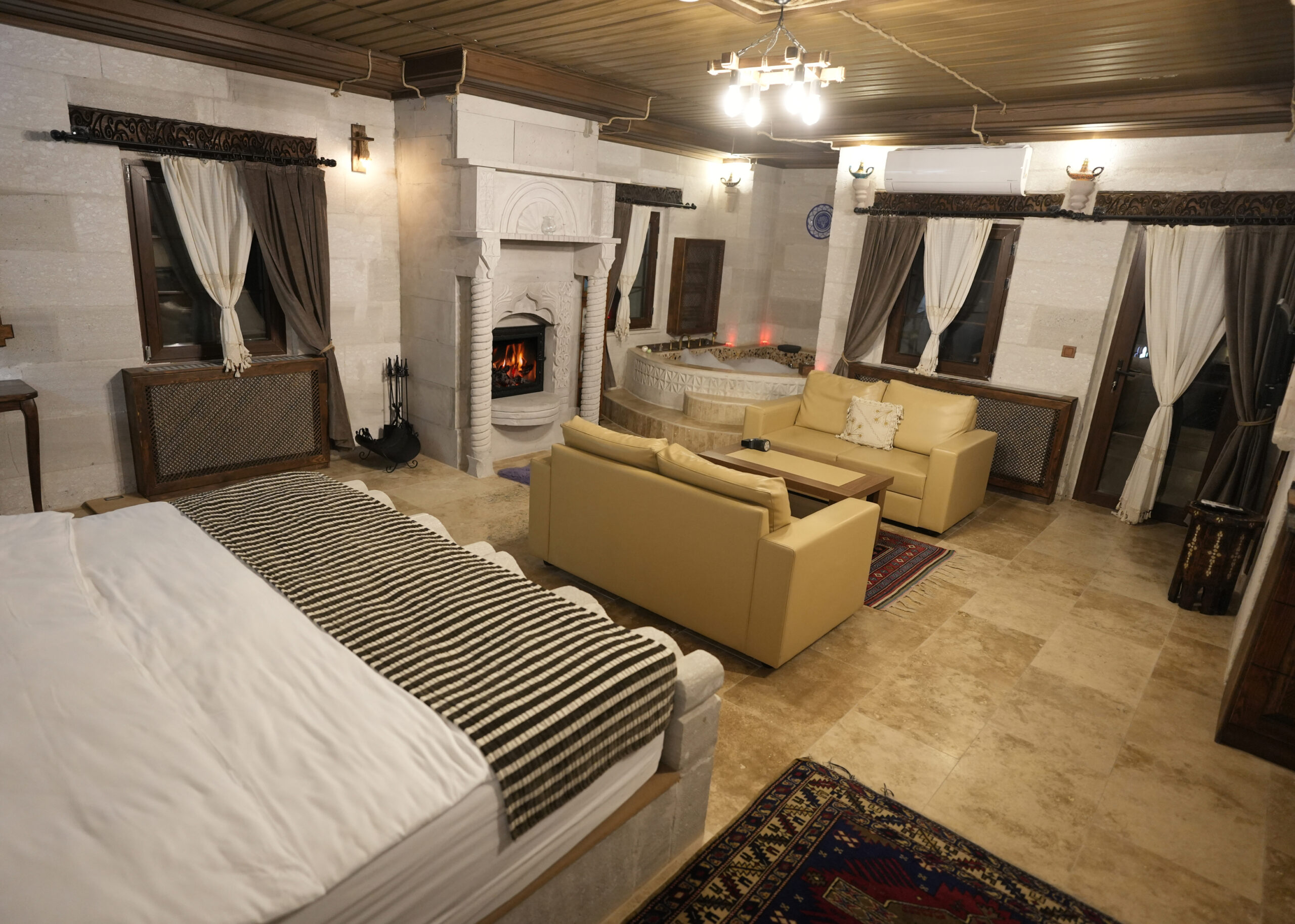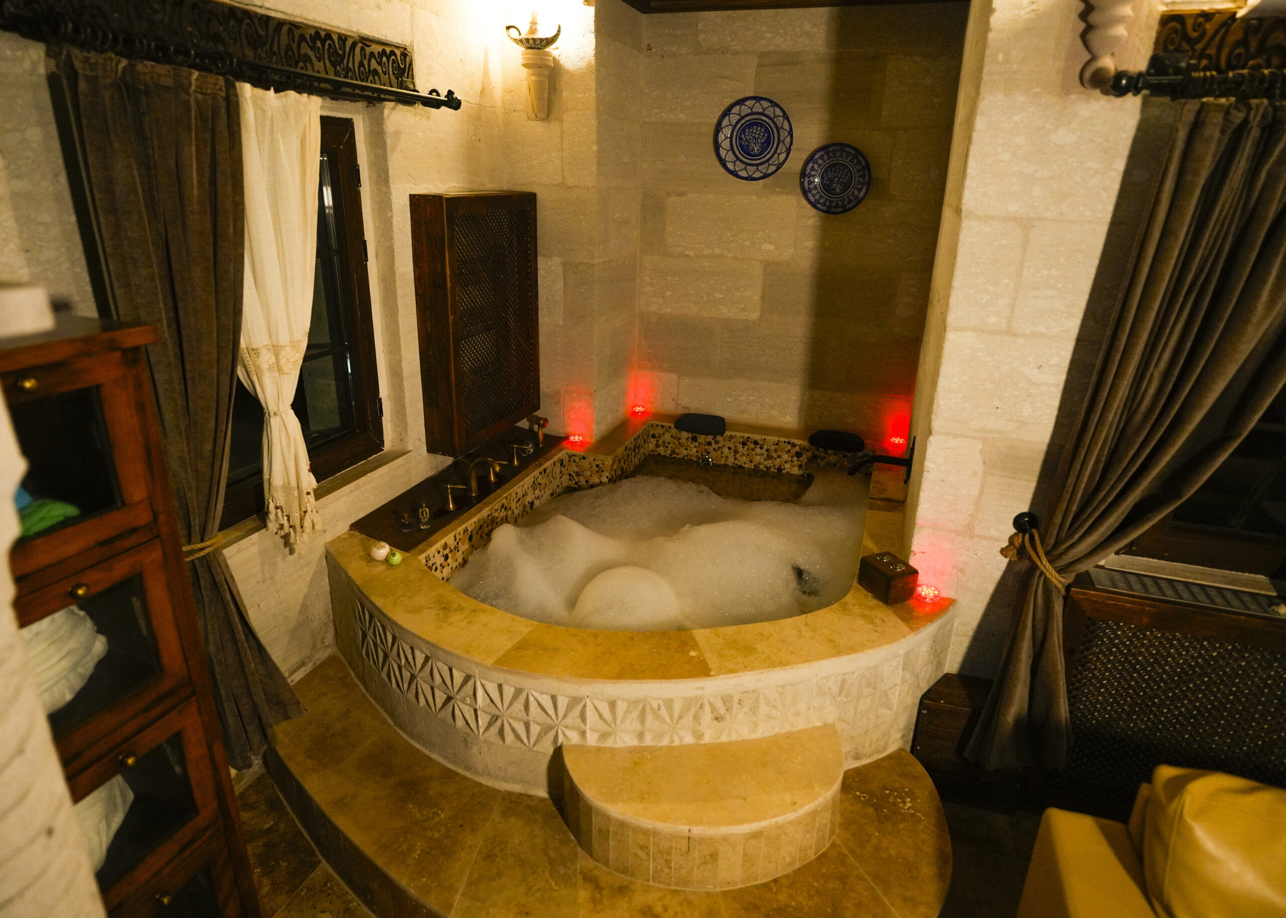 Odanın en ayrıcalıklı özelliklerinden biri olan özel jakuzi, günün yorgunluğunu atmanız ve tamamen rahatlamanız için size özel bir spa deneyimi sunar. Doğal dokularla dekore edilmiş bu özel alan, romantik ve huzurlu bir atmosfer yaratır.